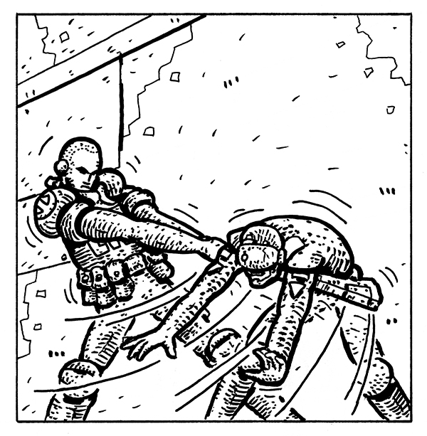 I tried them a few times early on but never liked them. After awhile, I was starting to think my action scenes were a little flat and lifeless, particularly when I started drawing the first couple fight scenes in “The Key”. I studied some Carlos Ezquerra Judge Dredd work (because Carlos is a master of sci-fi action comics) and realized, yup, I needed to add those speed lines.