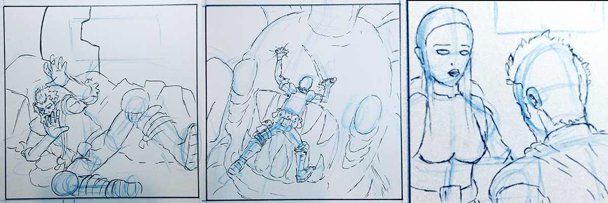 I used to do my rough pencil sketches, then really work them out in pencil still, and then my final inks. That’s hard, slow, and nerve-wracking. So I don’t do that anymore. Now I just do a really basic, rough pencil sketch (we’re talking stick figures and tube people!) then work it out with a rough, but very thin ink sketch, and then the final inks.