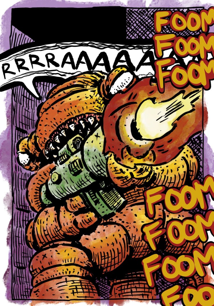 I posted some black and white art from one of my pages awhile back and asked if anyone wanted to take a crack at colouring it to see what they came up with, and Mikey DiZastre turned in this awesome piece! Love the watercolour/street art style!