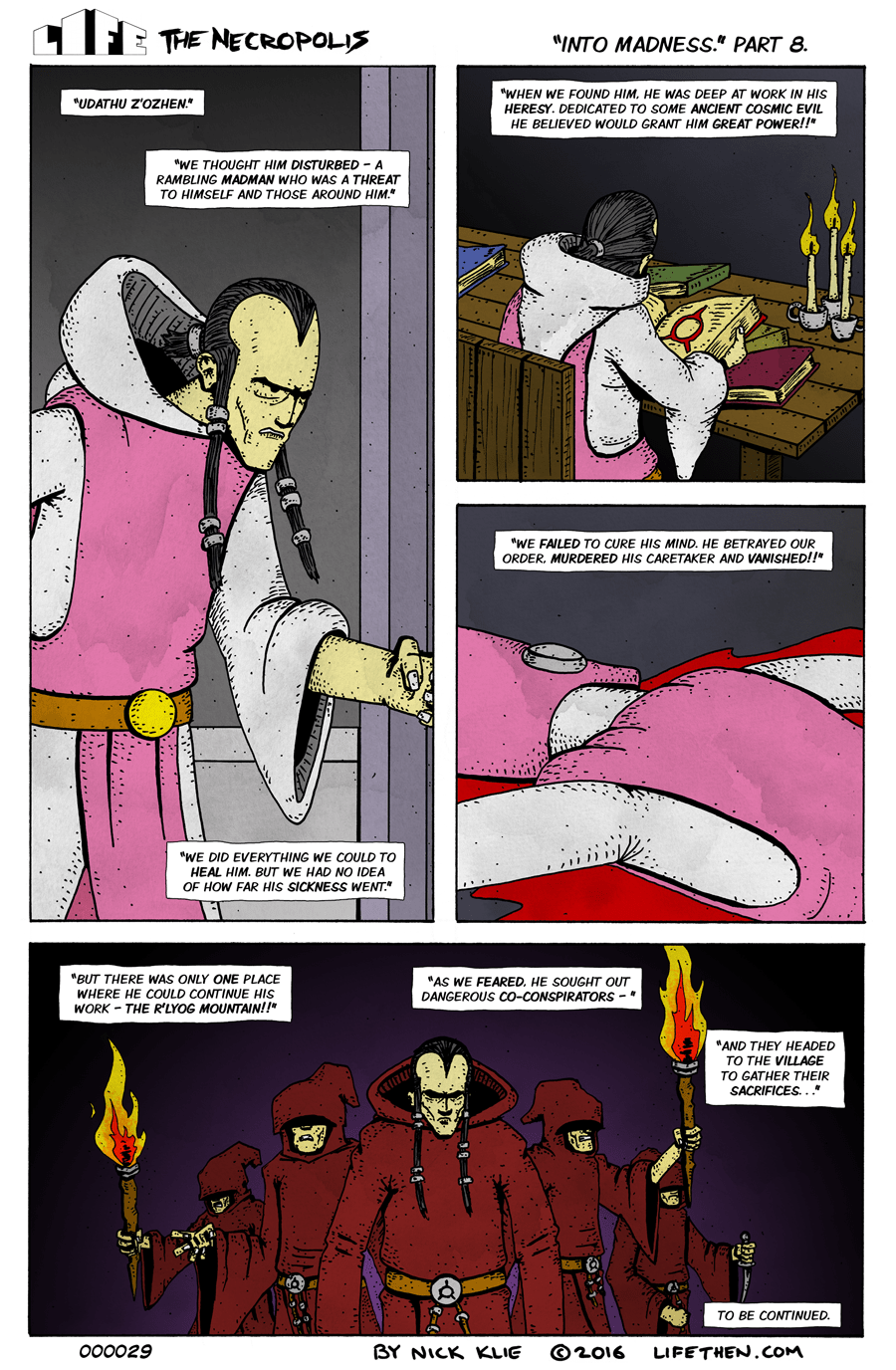 This comic was tagged adventure, apocalypse now, art, Carl Barks, Carlos Ezquerra, comic, comic book, comics, cthulhu, cultists, dagon, death spire cultists, draw, drawing, fantasy, Heart of Darkness, Heavy Metal, Herge, hp lovecraft, illustration, Jean Giraud, jungle, Life, Life The Necropolis, madness, Moebius, Necropriests, Nick Klie, pope, Ralph Bakshi, Ron Smith, Sci-Fi, Science-Fiction, scifi, sketch, sketchbook, space pope, Spitting teeth, swamp, watercolor, webcomic, webcomics, Wizards.