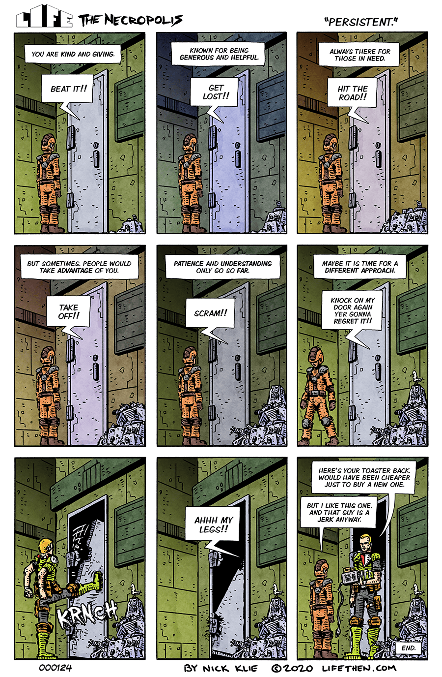 2. The pile of trash/rubbish collecting next to the door was a nice way to suggest the passage of time. Also, hilarious as always! Good job!