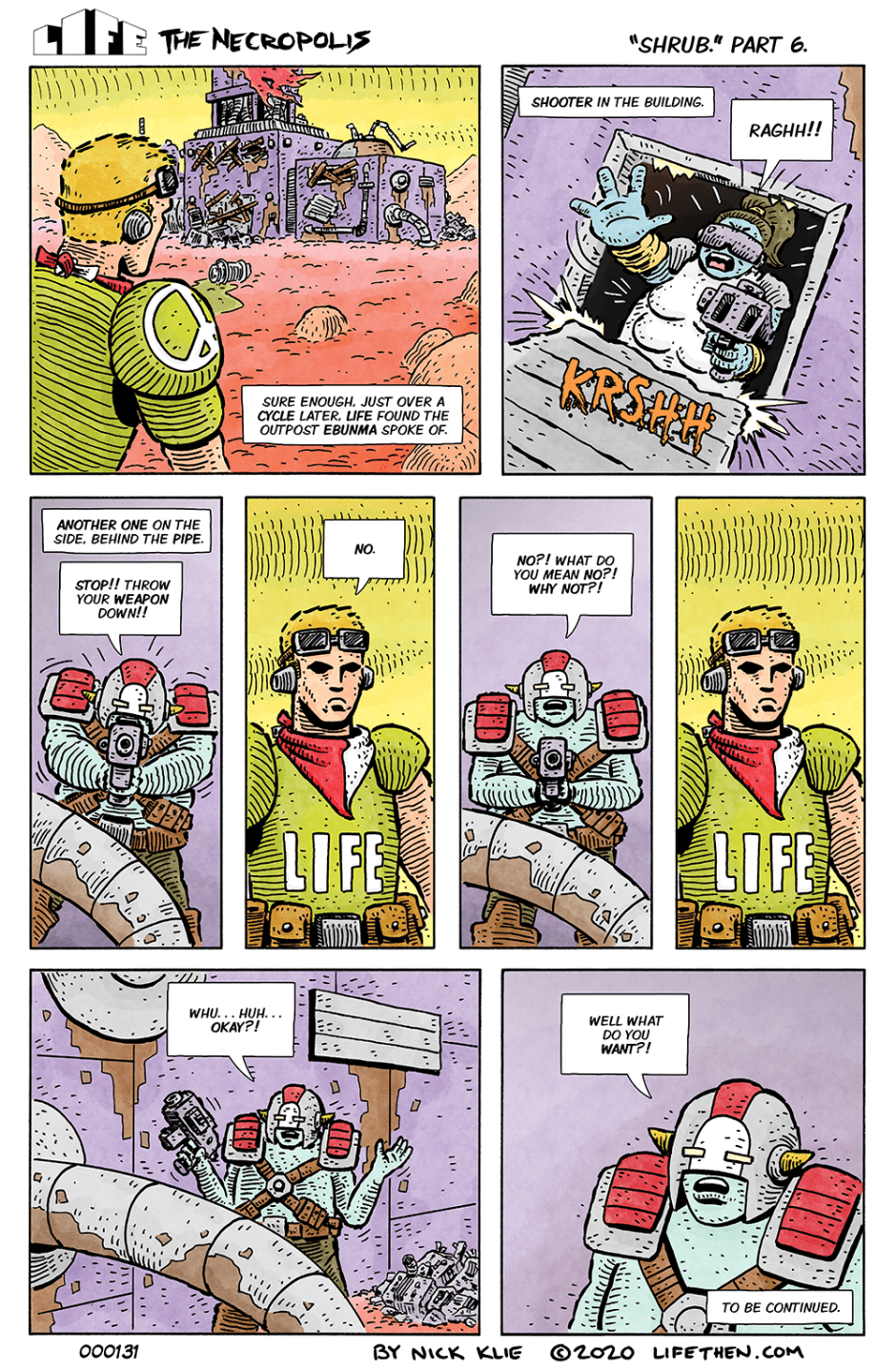 I drew the panels on this page out of sequence, and Ken’s art influenced how I drew the second panel. I wanted that panel to pop more than how the third panel turned out, so I tilted the shot, used a bunch of speed lines, and even added those little action explosions at the bottom. Way more cartoony than normal for me, but I really like how it turned out.