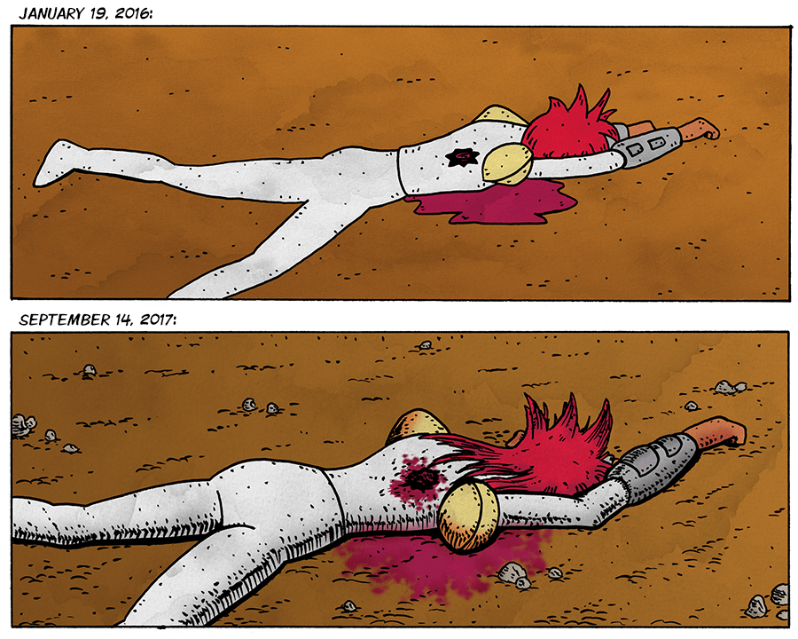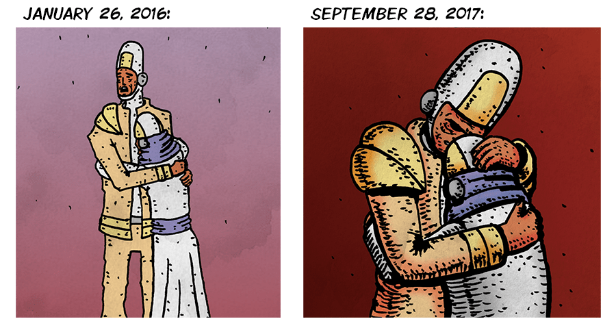 Normally I try not to be too obvious when I’m revisiting an idea, but for one of the first panels of Darkness, I flat out just redrew one of the panels of Light (I had also hoped that this would jog people’s memories that this was in fact a sequel.) Here’s the result: