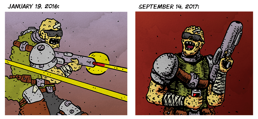 I don’t particularly go back and look at my older work from a critical point of view, but because this is essentially the same panel, the differences are pretty glaring. I think there is a pretty marked improvement in my drawing, and I feel really proud of that.