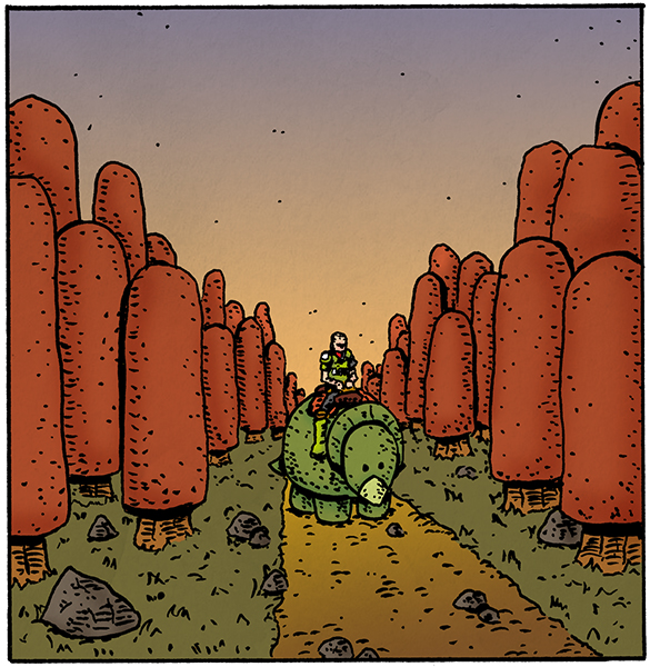 What I realized was that all I really wanted to do was draw a story about a wizard (Hawkwind sings a lot about wizards.) I also realized I didn’t really want to draw proper trees, and since this story was on some kind of alien planet, I could draw the trees any damn well way I chose, which is why they look like popsicles. And so, I came up with that week’s comic: “Tower.”